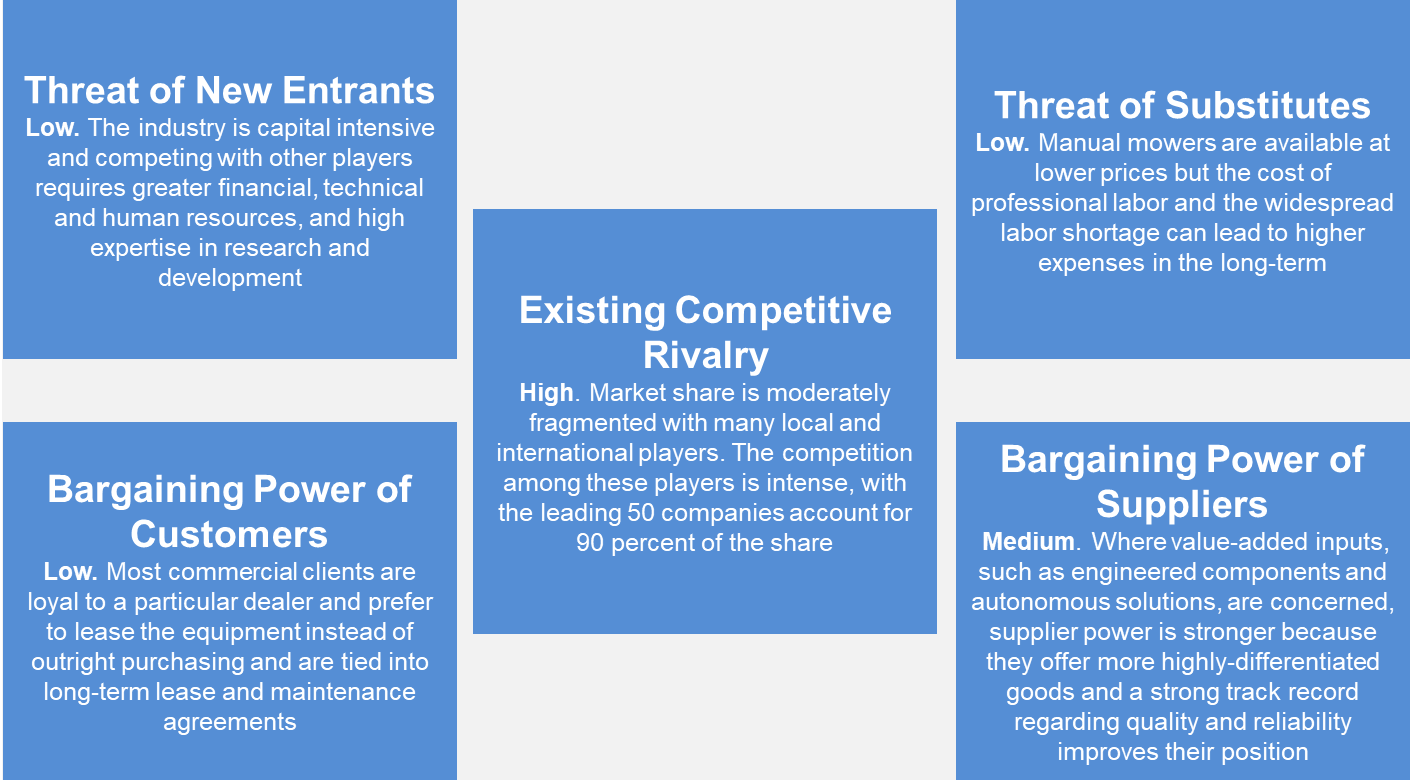 Where value-added inputs, such as engineered components and autonomous solutions, are concerned, supplier power is stronger because they offer more highly-differentiated goods and a strong track record regarding quality and reliability improves their position.