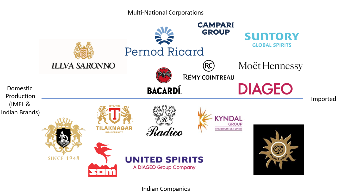 The Indian spirits market features a mix of multinational corporations and strong domestic players, segmented by production origin and brand ownership. Multinationals like Diageo, Pernod Ricard, and Rémy Cointreau are present in the premium and imported segments, while Indian firms such as Radico Khaitan, Tilaknagar, SOM, and United Spirits are present in domestic brands and Indian Made Foreign Liquor (IMFL), a category referring to spirits manufactured in India using imported or locally sourced ingredients, including whisky, rum, vodka, and brandy.