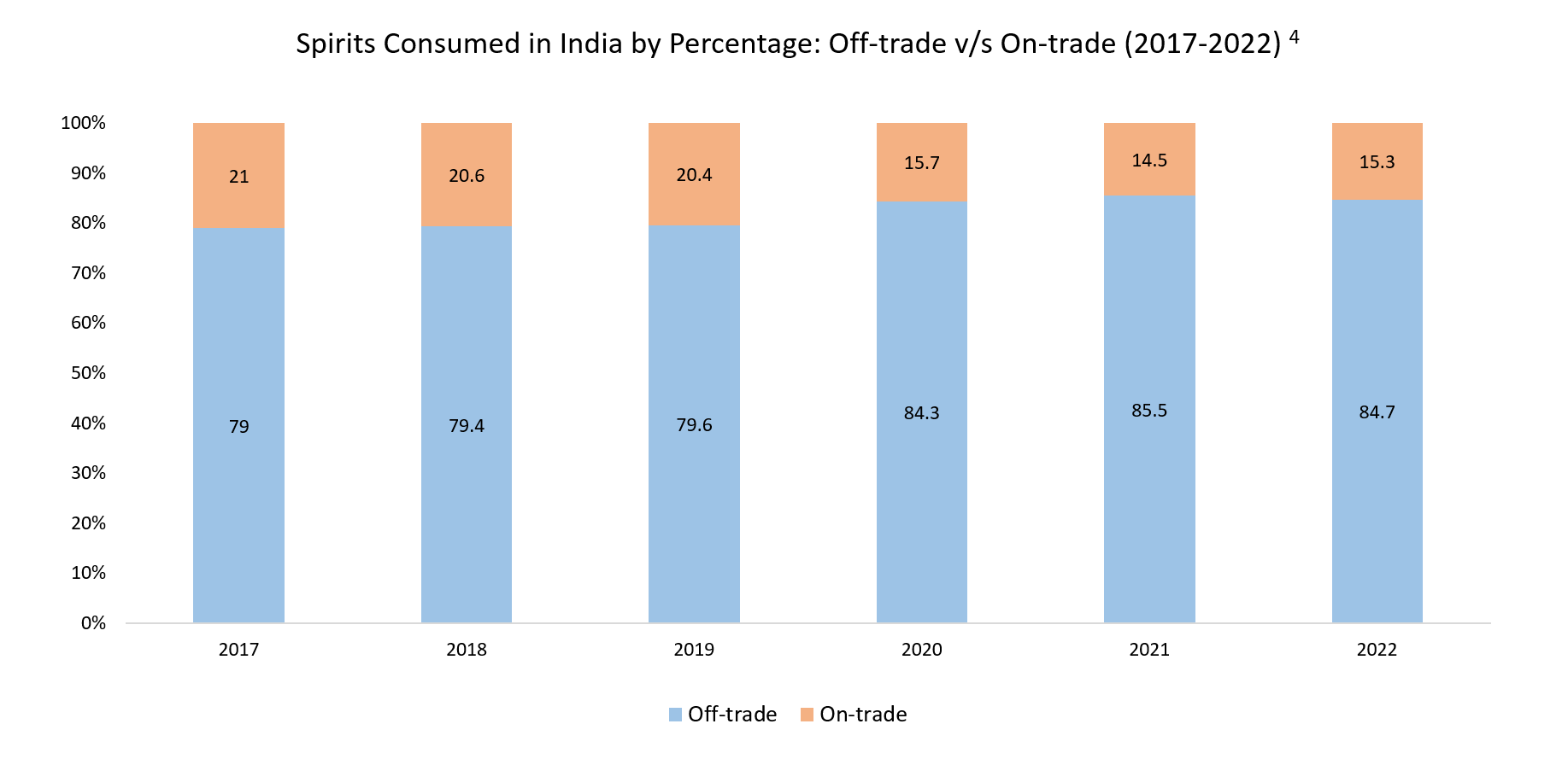 On trade means any alcohol that is sold in a trade establishment like a restaurant, or bar while off trade implies any alcohol sold in a retail store. This chart indicates that about 84.7% of the sales happen on retail counters across India, these can include alcohol retail shops, and hypermarkets.