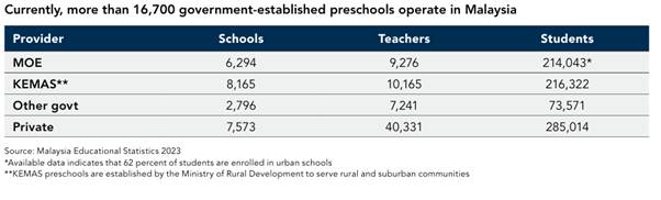 Number of Schools : As of 2023, Malaysia has about 16,700 government- established preschools and 9,100 privately run playschools. However, around 25% of privately run playschools shuttered during the COVID-19 pandemic and never reopened. 5 p68