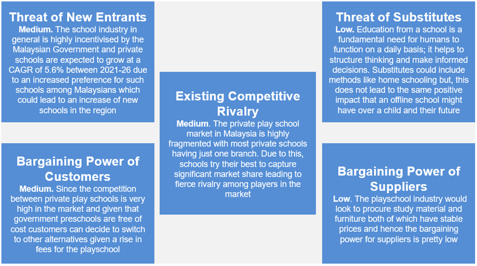 The private play school market in Malaysia is highly fragmented with most private schools having just one branch. Due to this, schools try their best to capture significant market share leading to fierce rivalry among players in the market.