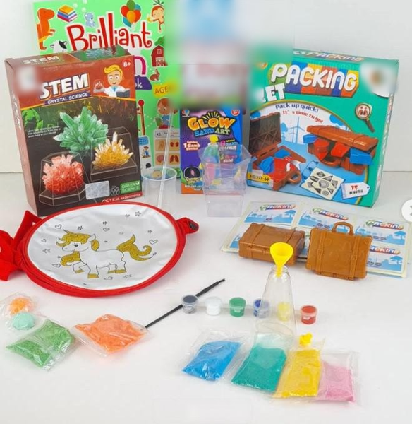 Each box contains DIY kits, toys and books.